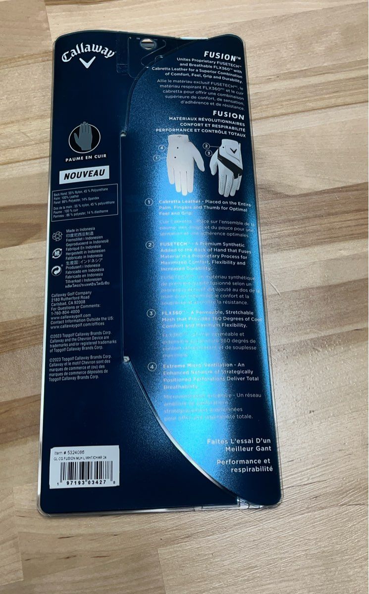 Description: Experience a better game with this brand new Callaway Fusion golf glove, engineered for total performance and control. This glove combines revolutionary materials and advanced technologies to provide exceptional comfort and breathability. The design features FUSETECH, a premium synthetic material fused to the back of the hand for maximized comfort, flexibility, and durability. For an unparalleled fit, FLX360 technology incorporates a permeable, stretchable mesh that delivers 360 degrees of cool comfort and movement. The palm is constructed from high-quality Cabretta leather, placed on the entire palm and thumb for a soft feel and enhanced grip. Additionally, extreme micro-ventilation is strategically placed throughout the glove to deliver total breathability, keeping your hand cool and dry round after round. This is a Men's Size Large glove, designed for the LEFT hand, ideal for a right-handed golfer.